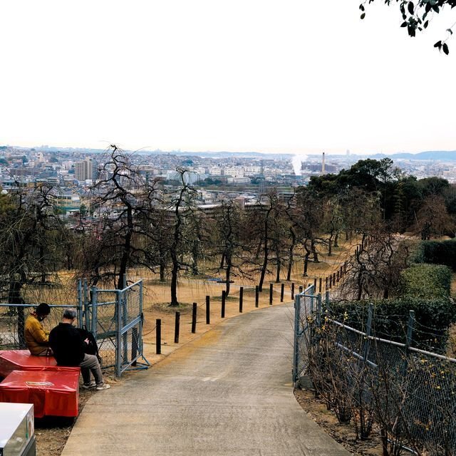 「しだれ梅園」でした。京都市内で梅の名所というと「城南宮」が有名ですが、こちらは山の斜面にある梅園で、園内はかなりの高低差があり、設けられている歩道に結構大変な石段がありまして、なかなか眺め良好。入り口付近が一番高所で宇治市内が一望できます。で、緋毛氈を掛けた椅子が出ているのは・・・
