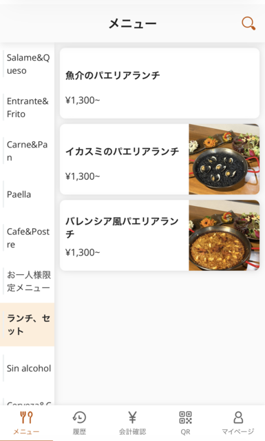 「魚介」「イカスミ」「バレンシア風」など本格的なパエリアランチが並びますが、今回は王道の「魚介のパエリアランチ」1,300円(税込)をオーダーしました。