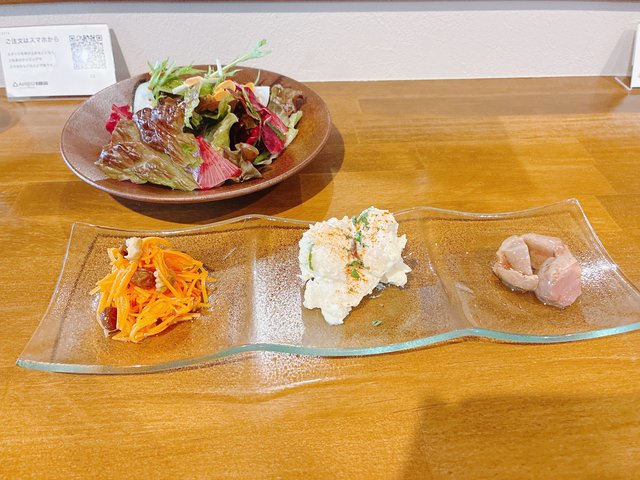 彩り豊かなサラダの横には、なんと「砂ズリ(砂肝)」と「ポテトサラダ」に「キャロットラペ」が。