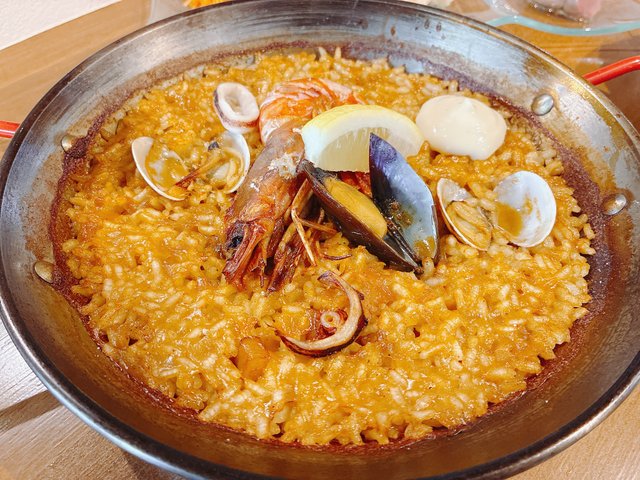 大きな海老、ムール貝、イカなどがゴロゴロと乗っており、見た目だけでテンションが上がりますね。