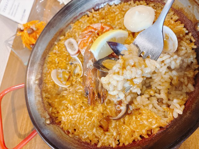 そしてメインのパエリアが登場!一人前ずつパエリア鍋で炊き上げられた熱々の状態で運ばれてきます。