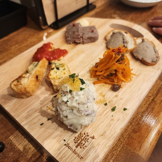 まずは「前菜盛り合わせ」¥1200から。いやー、このお値段でこういう仕事なわけで。ゼロ時の方向から時計回りで「自家製コンビーフ」、「鶏レバーパテ」、「キャロットラペ」、「燻製鯖のポテサラ」、「サーモンとほうれん草のキッシュ」という、いやー、このラインナップですか~!と驚きのある一皿。且つどれもちゃんと美味しくてニッコリ。特にキャロットラペがレーズン入り正統派で、発酵橙シロップで甘味付けをしていて、めっちゃ美味しかったです。
