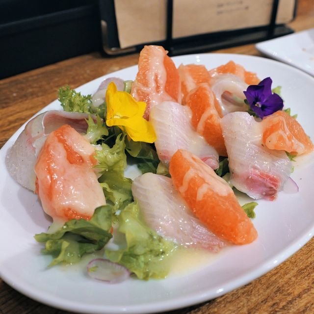 お料理2品目。「カンパチとグレープフルーツのカルパッチョ 発酵柚子ドレッシング」¥1200なり。いやー、これもこのしっかり量で¥1200で出しちゃうんだなあと言う驚きがある一品。ポテっとしたおろし野菜の入ったドレッシングが程よい柑橘味といやらしくない甘味でこれまたウマー!なわけで。