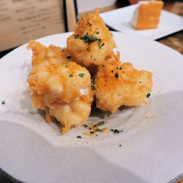 お料理三品目。「雲子のビールフリット」¥980なり。唐墨のパウダーを振りかけてあり、かりっとクリスピーな衣の中からアッツアツの雲子がとろーんと登場!と言う趣向。これまた期待を越えてくる一品でした。