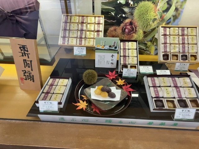 おおきに~豆はなどす☆今回は京都府亀岡市、中京区の中心に本店構える有名和菓子店の工場直営店。栗菓子で定評のあるお店で、特に代表銘菓『栗阿彌』は渋皮付きの大粒栗をゴロンと丸ごと使った野趣あふれる逸品。