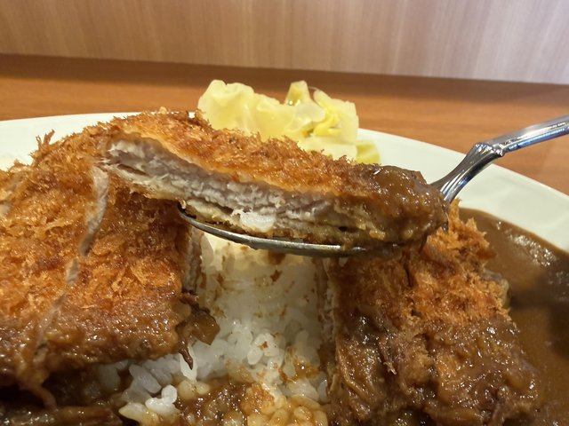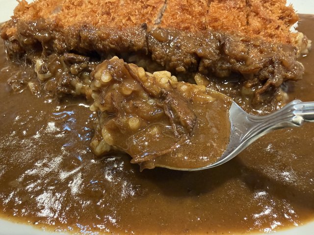 カツは厚切りではなく、カレーとの一体感を重視した仕上がり。ほどよい弾力で、噛みしめるごとに豚肉の旨みが広がります。カツをまとったルーを頬張ると、なんともリッチな味わいです。