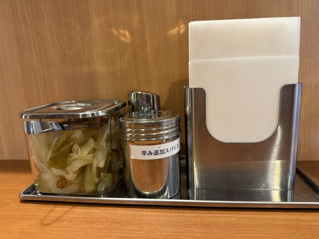 卓上にはキャベツのピクルスと追加用の辛味スパイスも用意。優しい酸味と柔らかな食感のピクルスが、良い箸休めになります。