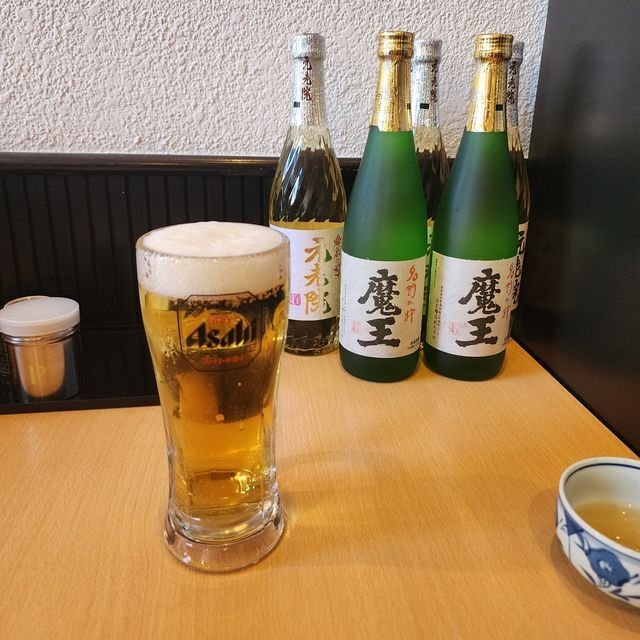 ワタシは、「生ビール」¥680を注文し、ほっこりしつつあたりを観察。何気に芋焼酎「魔王」の4合瓶がカウンター席の隅っこに並んでいるのが居酒屋さんですな。