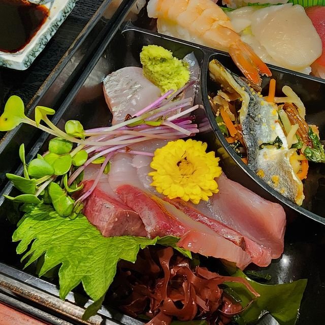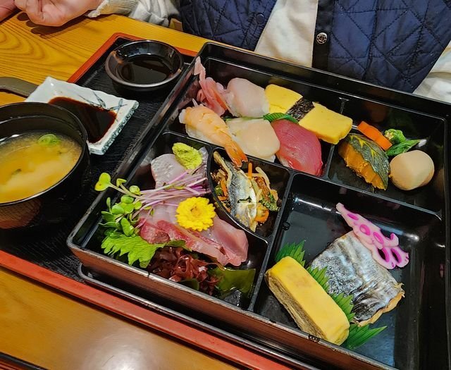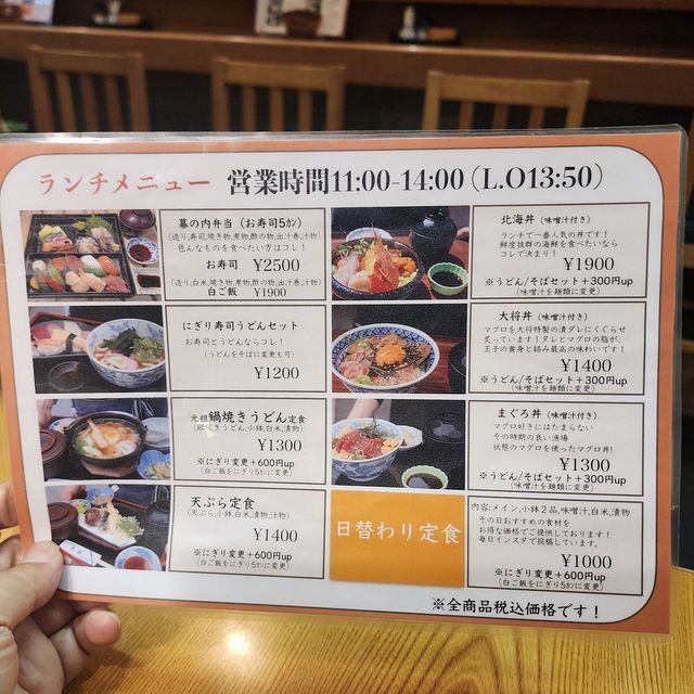 で、お昼時はこのようなランチメニューが完備。相方は「幕の内弁当」お寿司版¥2500!と即断即決~だったので、ワタシは「北海丼」の蕎麦セット¥2200!ということに。