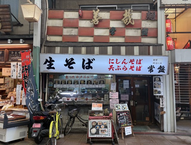 いぶし銀のような個性的な店舗が集まる「寺町専門店会商店街」。三条側から商店街へ入ってすぐの場所、矢田寺やとり市老舗の隣にたたずむのが、老舗の食堂「生そば 常盤(ときわ)」です。